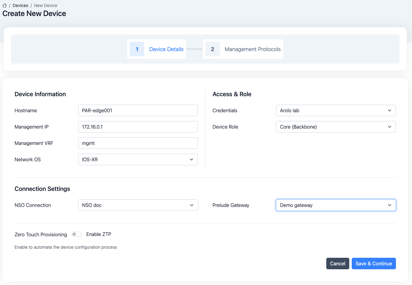 - NSO Connection Select the NSO instance you want to use to manage the device configuration. Keep it blank if you don't want to configure this device via Prelude