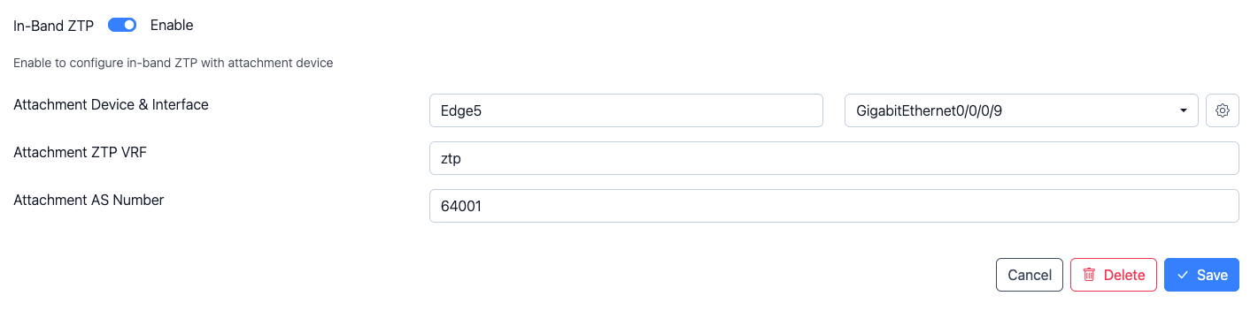 - Attachment ZTP VRF The VRF to use on the attachment device to forward the ZTP request