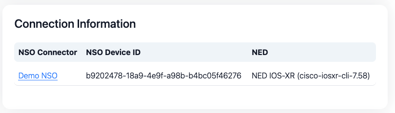 If you selected a NSO connector for the device, you will see on the Device settings page the NSO sync state and the NSO Device ID.