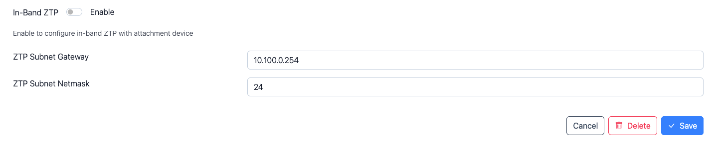 - ZTP Subnet Gateway The gateway to use during the first phase of the ZTP process (see our ZTP guide)