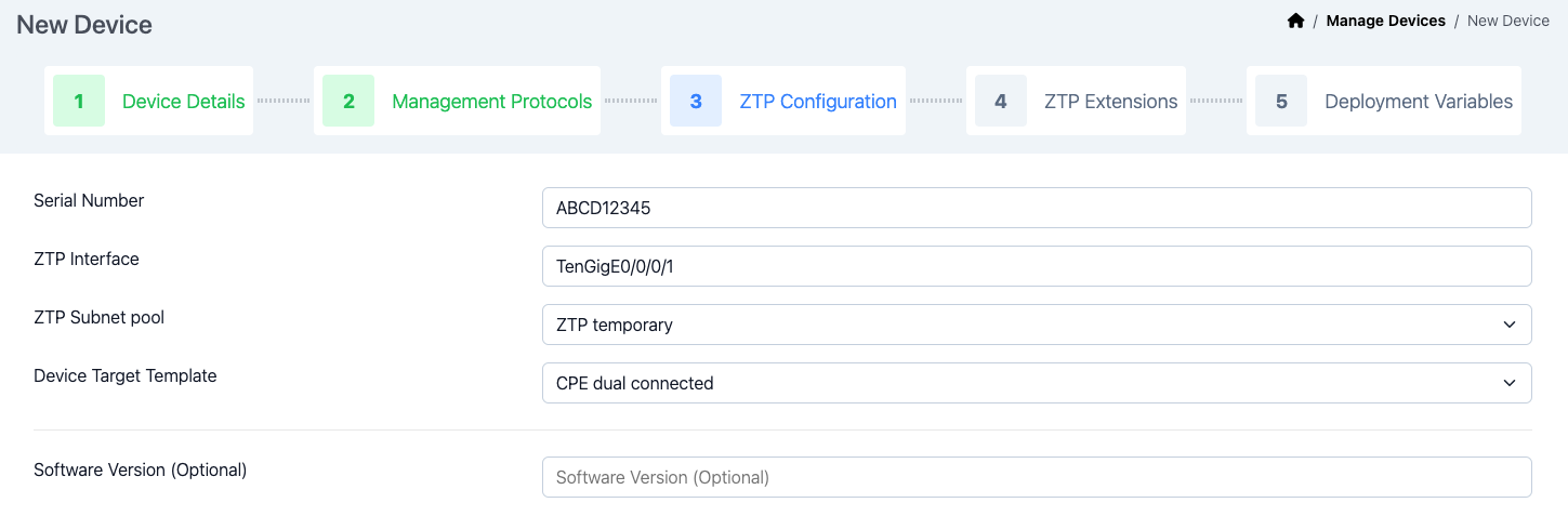 - Management IP The management IP address of the device. Keep it blank if you are using a ZTP extension that will allocate it